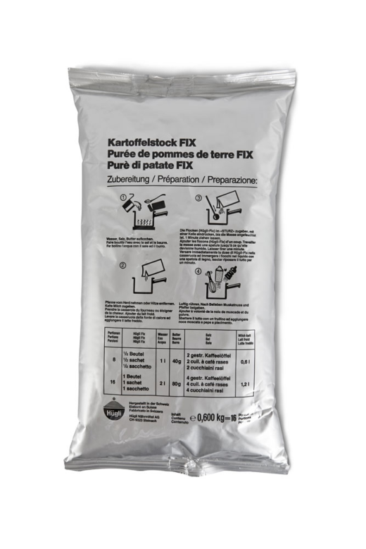 Die Flocken (Hügli-Fix) im "Sturz" zugeben, mit einer Kelle eindrücken, bis die Masse angefeuchtet ist. 1 Minute